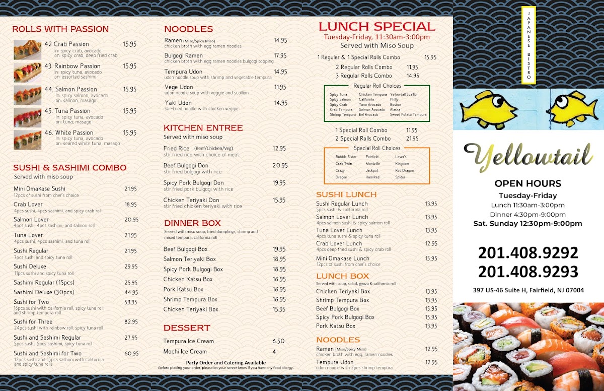 Welcome to Yellowtail Japanese Bistro, a culinary gem located at 397 US-46 Suite H, Fairfield, NJ. This bistro brings the heart of Japan to your plate with a carefully curated menu featuring an array of fresh sushi rolls and traditional Japanese dishes. From the classic Tuna Roll ($6.95) to the delightful Crazy Roll, every dish reflects quality and creativity.